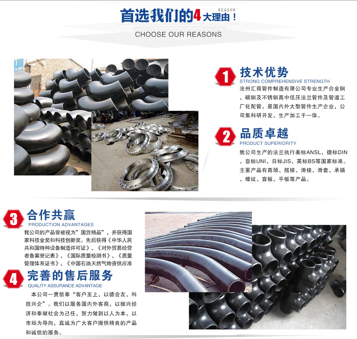 滄州匯商管件制造有限公司生產合金鋼、碳鋼及不銹鋼高中低壓法蘭管件及管道工廠化配管,是國內外大型管件生產企業,公司集科研開發、生產加工于一體。為實施長遠發展戰略,我公司與各大知名院校建立合作關系,開發新產品。完善的設備、的技術和高科技人才奠定了我公司承攬國內外大型工程的管件生產實力,尤其以核電站、火電廠、鍋爐廠、西氣東輸、化肥甲醇、大煉油、大乙烯、造船廠、制藥廠等項目為重中之重。